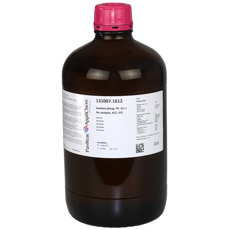 Acetona (Reag. USP, Ph. Eur.) para análisis, ACS, ISO en envase de vidrio ámbar de 2,5 Litros. CAS [67-64-1]. CODIGO DE COMPRA: PANR131007.1612