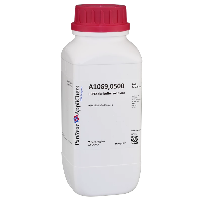 HEPES para soluciones tampón. CAS [7365-45-9]. Envase plástico de 500 g. CODIGO DE COMPRA: APPLA1069.0500